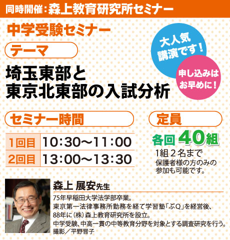 ※同時開催「森上教育研究所セミナー」は受付を終了いたしました。キャンセルが出た場合には募集を再開いたします。